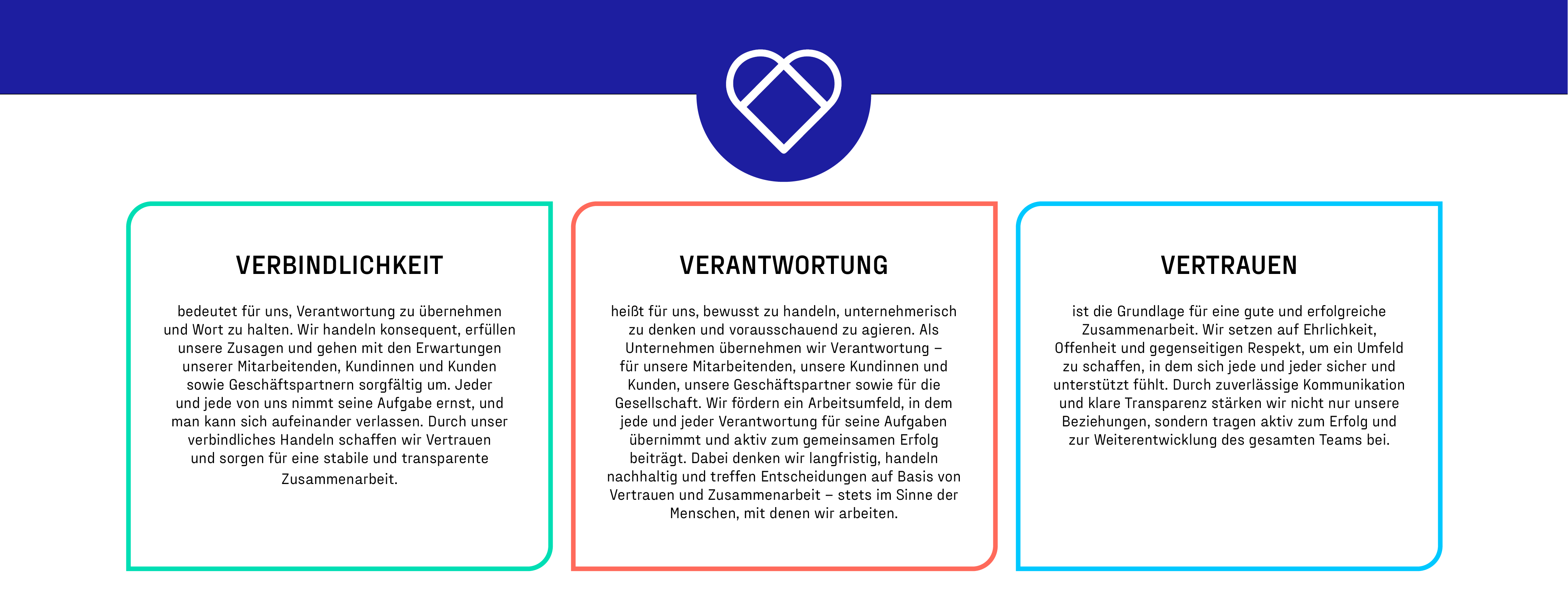 Was uns als Unternehmen ausmacht, sind nicht nur unsere Leistungen, sondern vor allem die Haltung, mit der wir arbeiten. Verantwortung, Verbindlichkeit und Vertrauen sind die Grundlagen unserer Zusammenarbeit – im Team ebenso wie im Umgang mit Kundinnen, Kunden und Partnern. Sie geben uns Orientierung in Entscheidungen, im täglichen Miteinander und bei der Weiterentwicklung unserer Unternehmenskultur. Wir leben diese Werte – jeden Tag und in jeder Entscheidung.