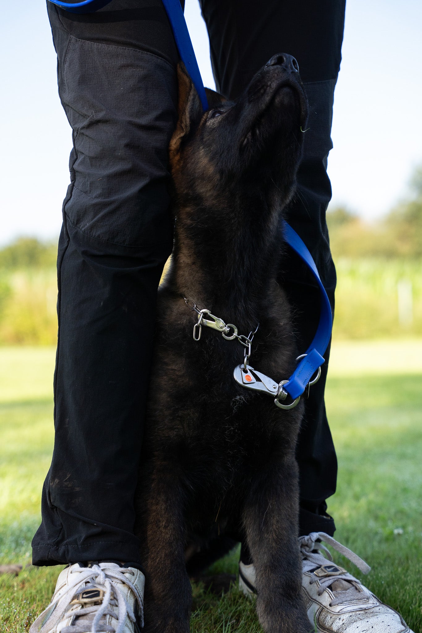 Hund mit orangenen Y-Geschirr beim Schutzdienst