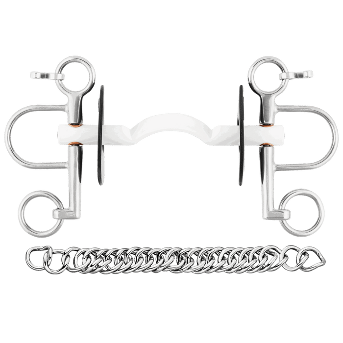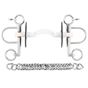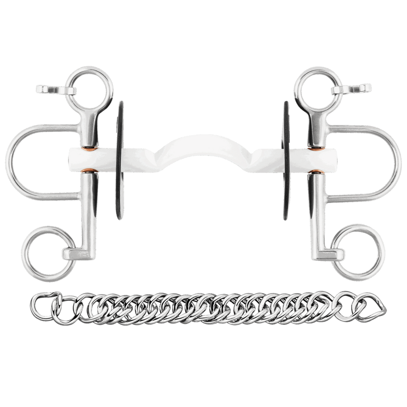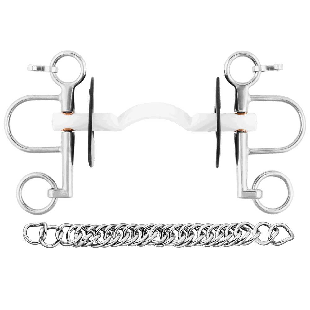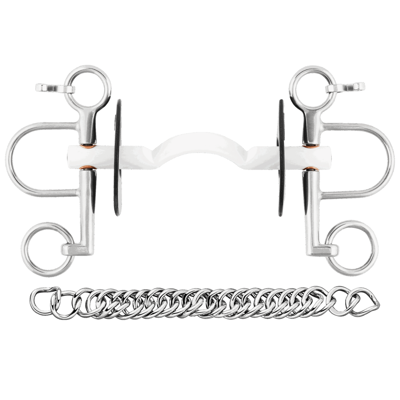Die Zungenfreiheit und die kurzen Anzüge dieses Gebisses sorgen für maximalen Komfort. Insbesondere die empfindliche Zungenmitte wird hier entlastet. Bei diesem Modell tragen die seitlich angebrachten Gebissscheiben zusätzlich zur Schonung der Maulwinkel bei.