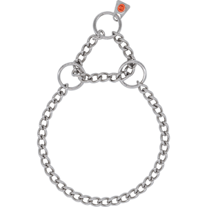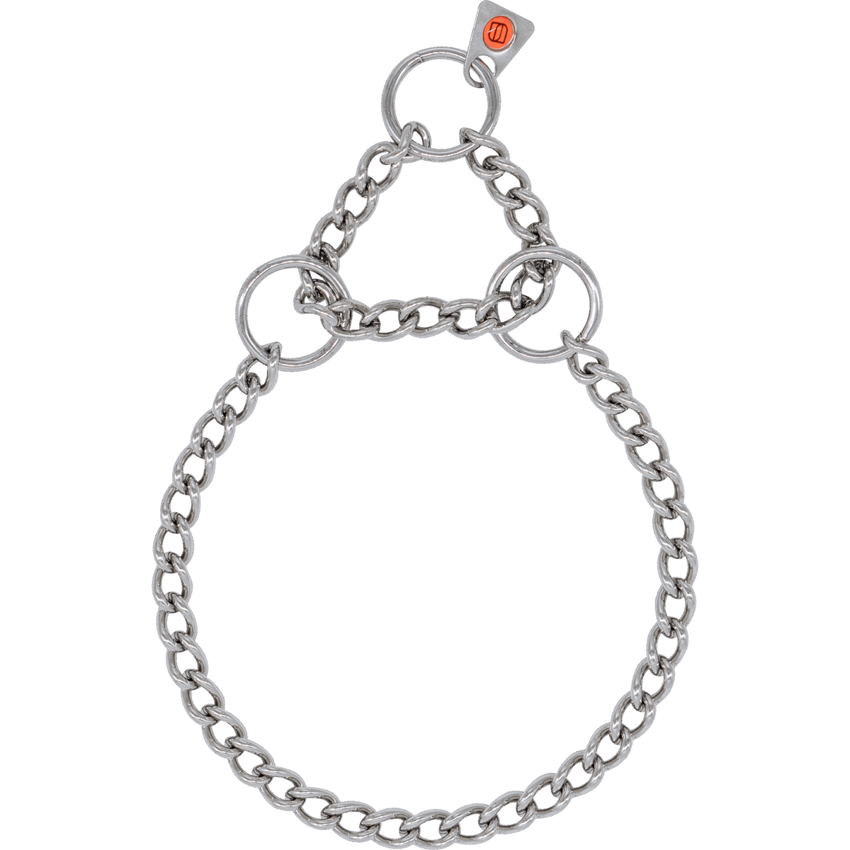 We produce curb chains made of different materials, in different wire gauges and designs (classic round curb chain or additionally flat polished for extra shine) as well as a variety of models (martingale collar or choke style).