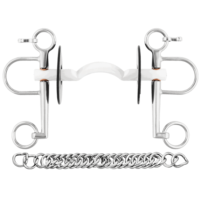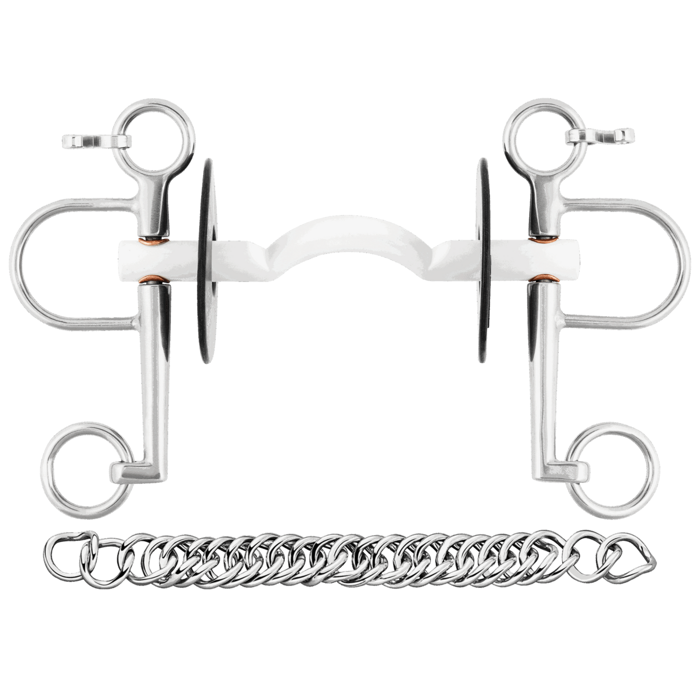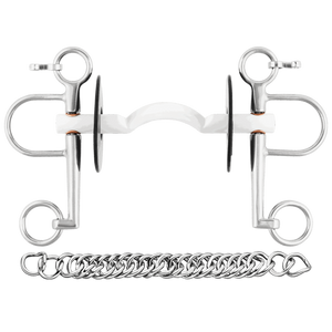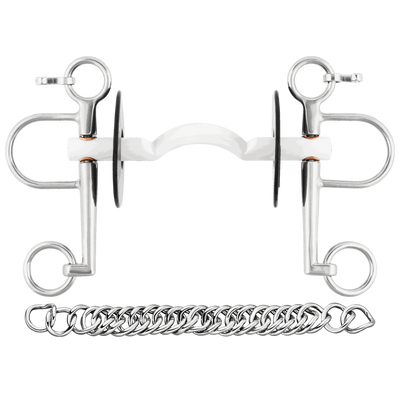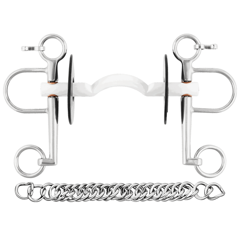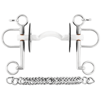 This bit's tongue clearance and short tongues provide maximum comfort. In particular, the sensitive centre of the tongue is relieved. On this model, the bit guards also help to protect the corners of the mouth.