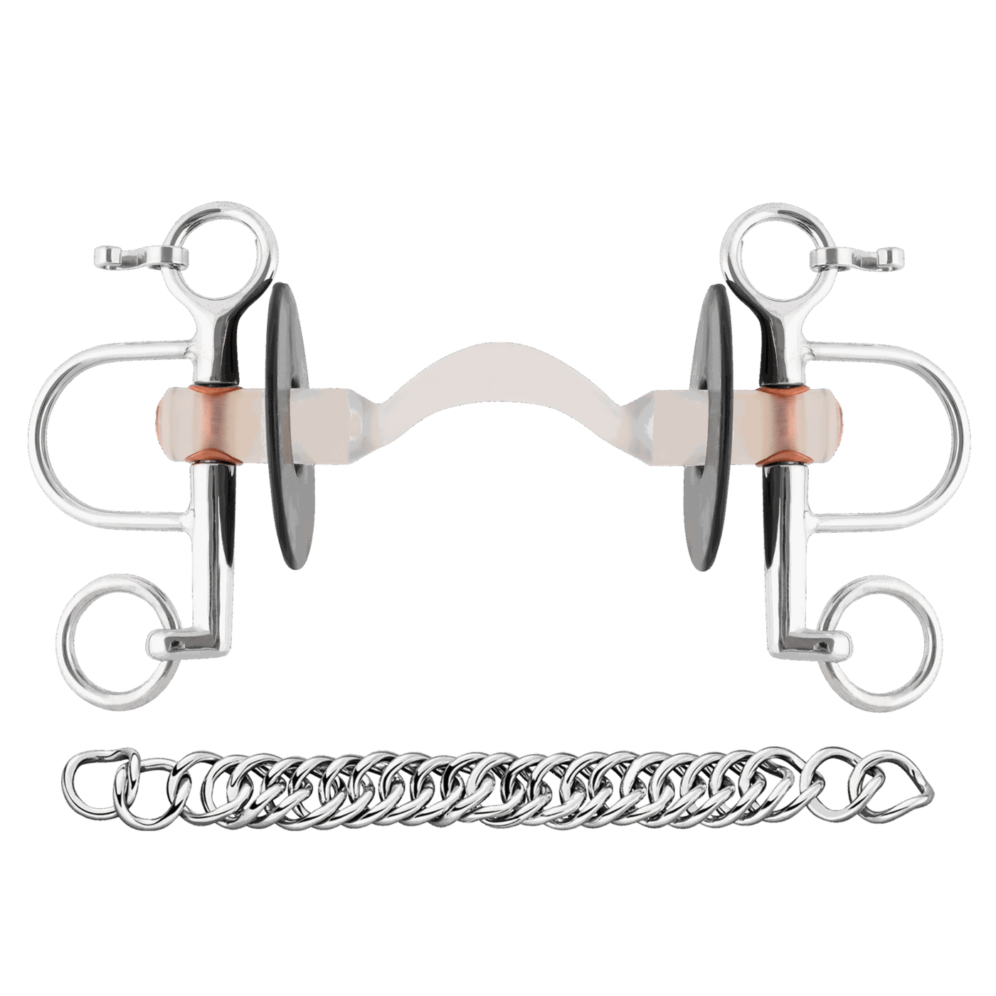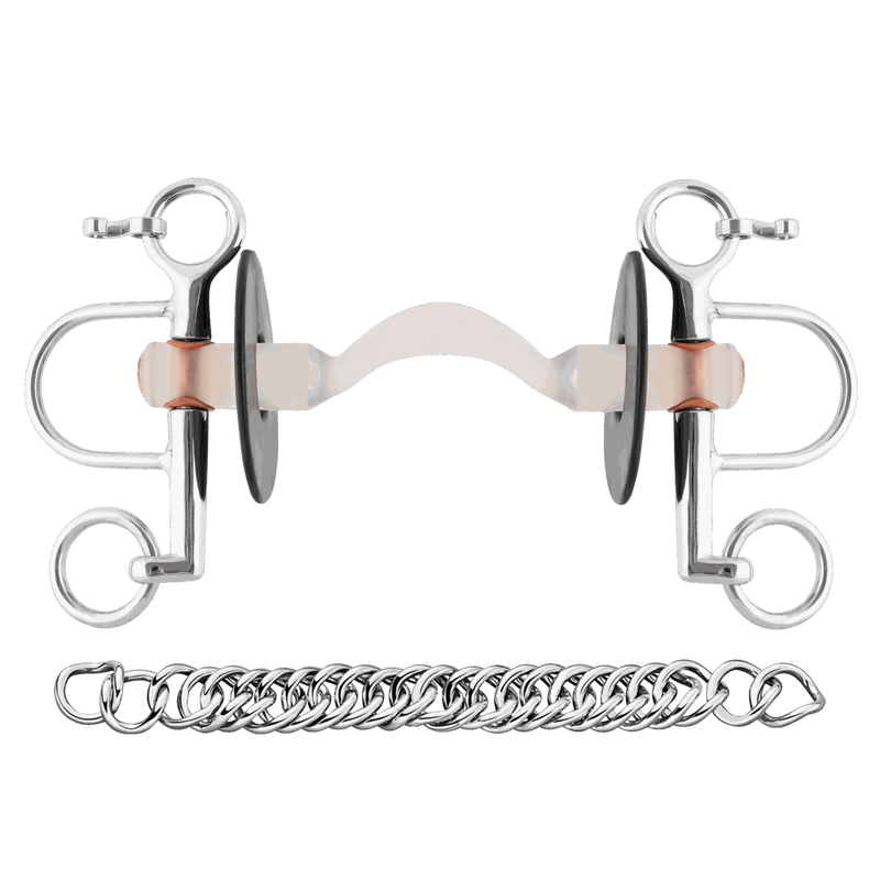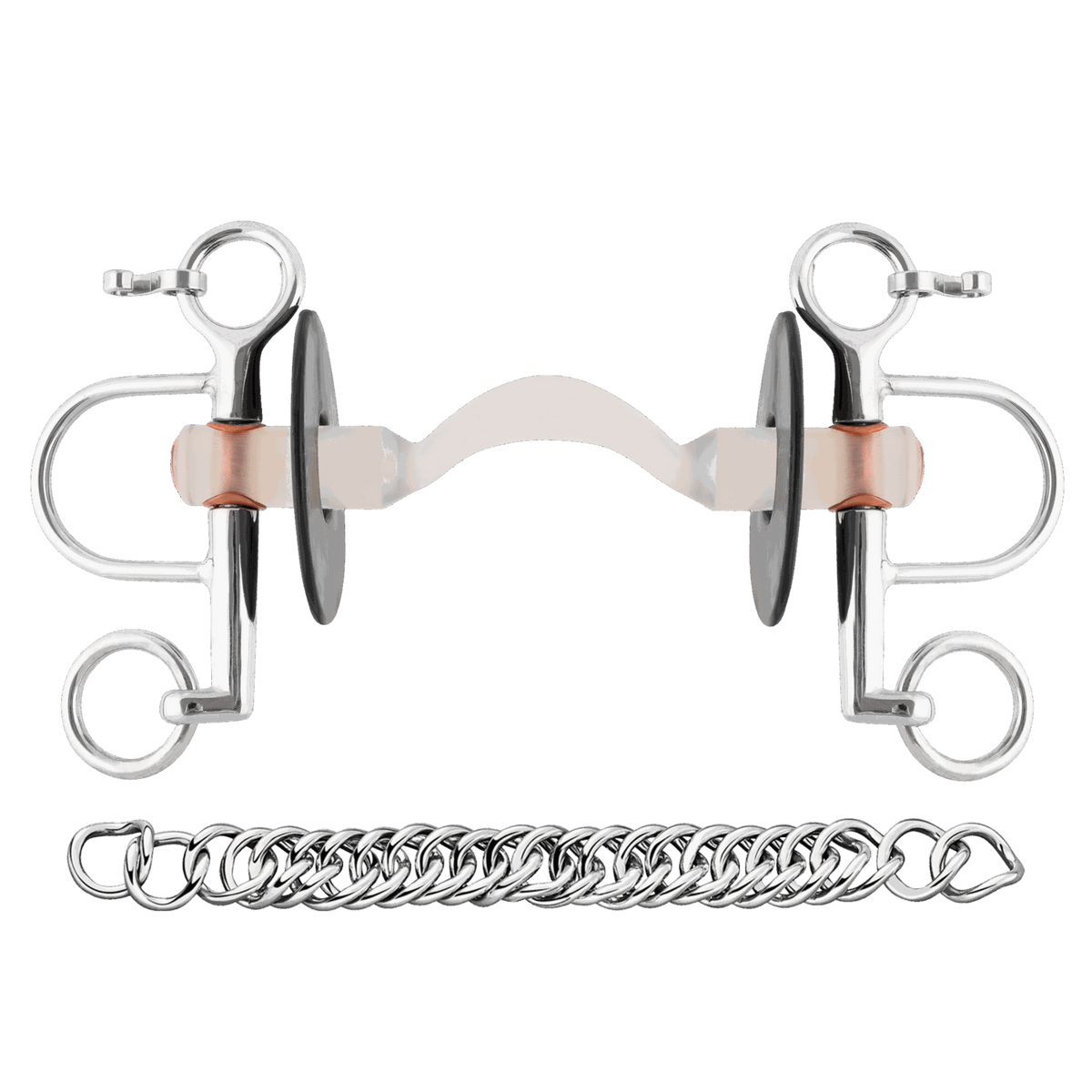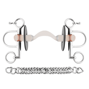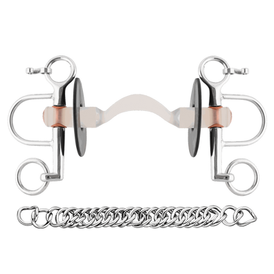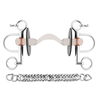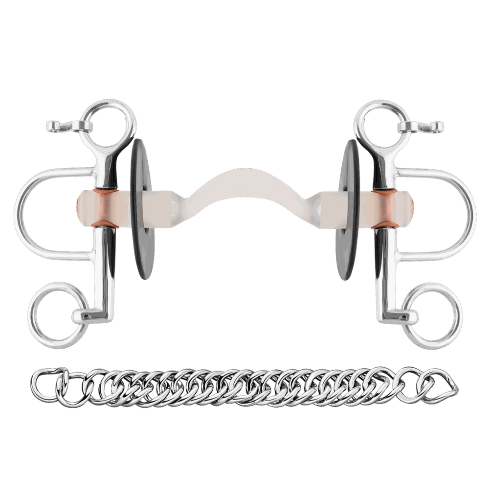 This bit's tongue clearance and short tongues provide maximum comfort. In particular, the sensitive centre of the tongue is relieved. On this model, the bit guards also help to protect the corners of the mouth.
