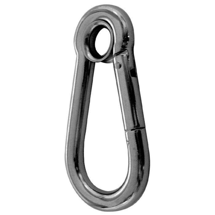 Universally applicable snap hooks with eyelet made of stainless steel.