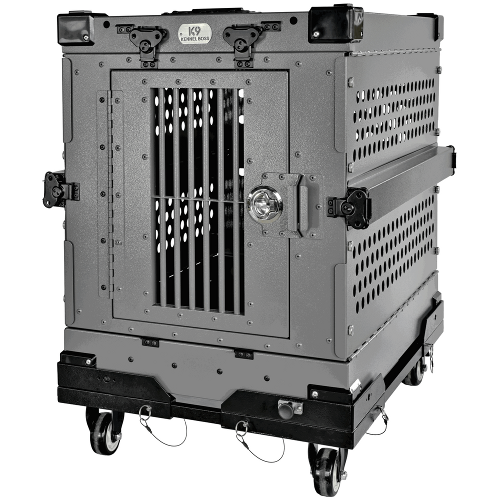 Constructed from durable and lightweight aluminum, it’s built to withstand rugged use while being easy to handle. Secure the crate to our modular cart quickly using the included spring plunger pins. The K9 Kennel Boss Modular wheeled crate cart is a game changer for crate mobility – built so that you can bring your pup with you wherever you travel!